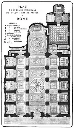 Kostel má dvoustupňovou a pětiosou fasádu, svisle členěnou trojicemi odstupněných pilastrů, ve čtyřech nikách jsou vloženy sochy: v přízemí králů Karla Velikého a svatého Ludvíka a v patře sochy francouzských královen svaté Klotildy a Johany z Valois. Na bohatě profilovanou římsu nasedá trojúhelný štít s francouzským královským erbem v kartuši nesené dvěma andílky. Chrám je pětilodní bazilika s 10 kaplemi, jejichž oltáře jsou orientovány na sever a na jih, s emporami nad postranními loděmi, s jižní královskou oratoří, otevřenou balkónem do apsidy. Prostor je dále osvětlený dvěma kupolemi, hlavní loď je sklenutá valenými stlačenými klenbami s pasy. Na jihovýchodní straně k chrámu přiléhá sakristie a barokní budova hospicu, původně ubytovna a nemocnice pro francouzské poutníky v Římě. Hospic má v portiku bustu Krista, údajně s portrétními rysy Césare Borgii.