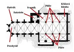 V místě, kde presbytář přechází v hlavní loď, jsou žebra nasazena na příporu, jejíž hlavice má výrazný abakus a prstenec.