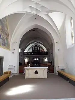 Loď je rozdělena do tří polí se šesti okny. Nad lodí se nacházejí tři pole křížové klenby s vyžlabenými žebry. V prvním poli se nacházejí konzoly, ostatní žebra končí useknutím. Na kruhových svornících je možné spatřit znak Pernštejnů (někde již chybí). Na konci lodi je kruchta vybudovaná v období baroka. Podpírají ji dva sloupy a zakončuje ji zábradlí, které bohatě zdobil řezbář a sochař František Malínský. Kostel býval bohatě zdoben a vybaven novogotickým zařízením. Klenby byly dekorovány ornamentálními malbami. U obou pozdně gotických dveří si můžeme všimnout jemných pískovcových prutů na vřetenovitých patkách a u postranních dveří renesanční řezby.