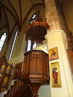 V západní části kostela se nachází balkonová oratoř, rovněž v pseudogotickém stylu, od architekta Gruebera. Je přístupná z prvního patra širokou arkádou. V západní stěně je prolomen vchod do věže, skrze kterou stoupá nové vřetenové schodiště. Žebra lodi jsou dvojitě vyžlabená, pásy oddělující východní a západní část jsou hruškovité.