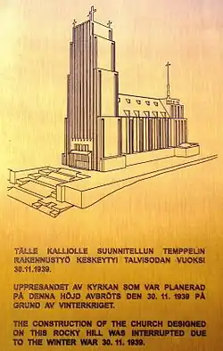 - anglicky: THE CONSTRUCTION OF THE CHURCH DESIGNED ON THIS ROCKY HILL WAS INTERRUPTED DUE TO THE WINTER WAR 30. 11. 1939