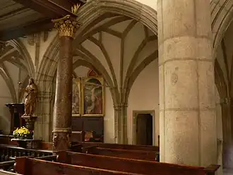 V západní části je cenná pozdně gotická kruchta, podepřená svazkovými pilíři. Prostor pod kruchtou je zaklenutý síťovou klenbou z osmicípých hvězd. Na kruchtu se vchází sedlovým portálkem s přetínanými pruty z roku 1510.