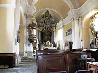 Loď je zaklenuta valenou klenbou na pasech, mezi pilastry na bočních zdech jsou mělké oltářní výklenky. Jsou v nich dvě dvojice protějškových zděných oltářů se štukovou výzdobou. Na podstavcích jsou umístěny schránky s relikviemi, mezi nimi relikviář s ostatky sv. Jana Sarkandera.[7] Do lodi vybíhá konvexní zděná kruchta na třech arkádových obloucích zakončených římsou, nad kterou je vyzděná poprseň zdobená dekorativním štukovým pásem.