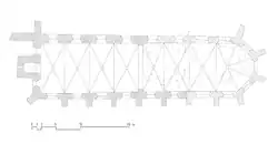 Kostel je 43 m dlouhý, 10 m široký a 17,50 m vysoký se sedmi příčně orientovanými obdélnými poli zaklenutými křížovými žebrovými klenbami. Chór se dělí na loď, které přísluší první čtyři pole, a presbytář, kterému přísluší poslední tři pole a závěr. Chór zakončuje pět stěn osmiúhelníku, tuto část klene šestipaprsčitá klenba. 4 metry široká věž, v dolní části na půdorysu tvaru obdélníku a výše pak oktogonální, je připojena k prostředku západního průčelí. Klášter z období středověku se nacházel u severní strany kostela. Zlomové zdivo a ve velké míře i cihly byly použity jako stavební materiál, lze je vidět na severní straně, na věži a západním štítu. Tyto cihly mají rozměry 270 x 140 x 80 mm). V interiéru je kostel přepatrován dřevěnou konstrukcí, původně byl vnitřek rozdělen na pět částí.