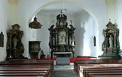 Presbytář má plochý strop. Kouty lodi jsou při něm zaobleny. Obdélná loď je členěna pilastry s volutami a mušlovým dekorem. Loď je kryta stropem s fabionem a obrazem Krista uzdravujícího ženu. Kruchta má dřevěnou poprsnici na dvou pilířích. Sakristie má plochý strop.