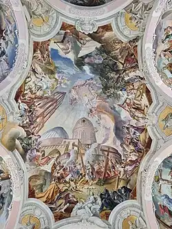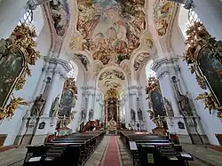 Sochařskou výzdobu exteriéru a interiéru vytvořil v letech 1727–1731 sochař Karel Josef Hiernle. Klenby pokryl v roce 1733 freskami mnichovský malíř Cosmas Damian Asam, štukové rámce provedla dílna jeho bratra Egida Quirina Asama.