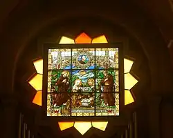 - Sklomalba ve tvaru betlémské hvězdy: Narození Páně s klaněním dvou františkánů, sv. Františka a sv. Antonína Paduánského, v medailonu je hlava kardinála Emanuela Merciera, pod jehož patronací Belgičané okno darovali kostelu v roce 1926