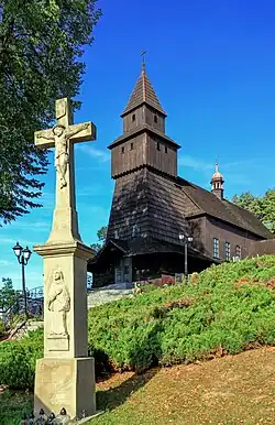 Kostel je orientovaná jednolodní dřevěná roubená stavba postavená na cihelné podezdívce na návrší. Kněžiště je menší než loď, je ukončené trojbokým závěrem a z jihu přiléhající malou přístavbou s oratoří v patře. Loď má půdorys obdélníku se sakristií a kaplí na severní straně a předsíní na jihu s bočním vchodem. Dvou hřebenová sedlová střecha nad lodí a kněžištěm je krytá šindelem. Na hřebeni lodi je umístěn osmiboký sanktusník s lucernou a cibulovou bání krytou plechem. Stěny kostela jsou deštěné a obtočené sobotami s šindelovým pultovým zastřešením..