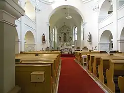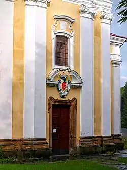 Nad vchodem kostela je znak šlechtického rodu Kinských, kteří se o rozvoj obce po roce 1726 podstatně zasloužili. Hrabě Josef Jan Maxmilián Kinský byl v kostele roku 1780 pohřben a má poblíž oltáře náhrobek.