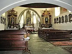Kostel má jednu plochostropou kostelní loď. Klenutý presbytář (kněžiště) je pětiboce uzavřen; klenba presbytáře je šestidílná. Věž je hranolová s cibulovou bání s laternou.[2][5]