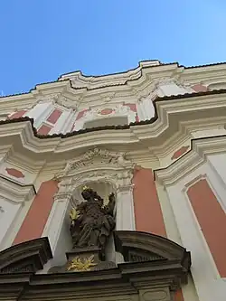 V nadpraží hlavního vchodu do chrámu stojí kamenná socha sv. Voršily, jejímž autorem je pravděpodobně Ottavio Mosto (1701); sochy sv. Markéty, Agáty (Háty), Panny Marie Immaculaty, šesti andělů a archanděla Michaela dodala dílna Matěje Václava Jäckela. Před kostelem stojí pískovcové sousoší svatého Jana Nepomuckého se dvěma andílky po stranách, andílci nesou kartuše s Janovými atributy: monstranci a staroboleslavské paládium. Sousoší vytesal Ignác František Platzer v letech 1746-1747 původně jako vrchol kašny, podle architektonického návrhu Kiliána Ignáce Dientzenhofera[5]. Kašna musela koncem 19. století ustoupit dopravnímu provozu ulice.