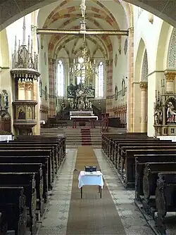 Tři kostelní lodě jsou uzavřeny pětibokými závěry a tyčí se nad nimi dvě mohutné věže. Obě byly původně vyšší a v posledním patře je spojoval krytý most. Uvnitř jsou zdi osazeny zajímavou galerií patnácti renesančních náhrobků z přelomu 16. a 17. století, vyrobených z mramoru a červeného pískovce. Do chrámu se vstupuje západním portálem v pronikavě novogoticky upravenému průčelí s rozměrným oknem. Rozsáhlé úpravy v novogotickém slohu, které měly vrátit chrám do původní podoby, vedly však k neprospěchu celé stavby.
