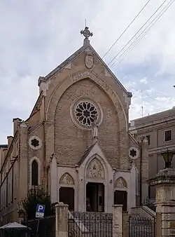 Fasáda z cihel a travertinu, k níž se vstupuje po širokých schodech, má portikus, do něhož se otevírají troje dveře; v tympanonu středních dveří je polychromovaná mozaika zobrazující Neposkvrněnou Pannu Marii pomocnou mezi anděly a na věžičce tympanonu je socha Vykupitele z karrarského mramoru. Fasádu dále zdobí rozetové okno.