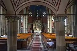 Jedná se o pseudogotickou trojlodní stavbu s vysokou průčelní věží. V 90. letech 19. století nahradila tato stavba původní dřevěný kostel, který již nestačil pro rozvíjející se průmyslové město a nárůst počtu jeho obyvatel. Původní kostel byl na tzv. starém hřbitově, což je zhruba 500 m od nové budovy kostela. Dnes stojí kostel v centru města, na Masarykově náměstí. Kolem kostela se nachází park, před kostelem stojí tzv. „Kristiánův kříž“, který je na seznamu Kulturních památek ČR. V noci je kostel nasvícen.