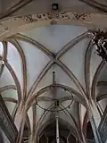 Půdorys patra kostela; červená: pozdně gotické zdivo, modrá: renesanční zdivo, béžová: barokní zásahy, zelená: klasicistní zdivo, žlutá: historismus a secese, světle modrá: nové zásahy