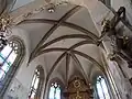 Přechod z předsíně do lodi kostela je doprovázen poloviční křížovou klenbou. Široké síňové trojlodí je zastropeno křížovou žebrovou klenbou, kterou nesou čtyři pilíře. Na styku žeber se nacházejí erby Pernštejnů. Podél žeber se nacházejí charakteristické žluto-černé dekorativní pásy. V lodi se dále nachází kazatelna a tribuna (kruchta) s varhanami a zdobené zábradlí.