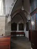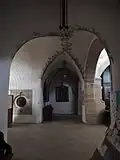 Za vstupem přes západní portál se nachází předsíň, která volně přechází na východ do lodi a na sever do kaple. Ta vychází z kruhového půdorysu a přechází do kupolové klenby. Nachází se zde i zpovědní místnost. Strop předsíně je řešen křížovou klenbou z kamenných žeber, které sbíhají na pilíře podpírající půlkruhové arkády. Velmi podobným způsobem je řešena i hlavní loď. Na západní a jižní stěně jsou umístěny vitráže.