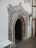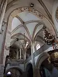 Trojramenná tribuna se nachází v bočních lodích a v posledním západním poli. Pod oběma bočními tribunami se nacházejí boční vstupy vedoucí k portálům na severní a jižní straně. Sloužila k provozování duchovní hudby a zpěvu při bohoslužbách a vyjádření nadřazené postavení patrona kostela. Tribunu obklopuje bohatě zdobená zídka s výraznými římsami a figurálními a vegetabilními vzory.