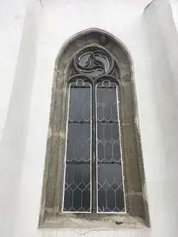 Celý presbytář je zakončen třemi stranami osmiúhelníku a v jeho prostoru se nachází tři okna. Všechna tři dvoudílná okna jsou zakončená lomeným obloukem, ohraničená profilovaným ostěním a vyzdobená rozdílnými plamínkovými kružbami. Dvě ze tří oken jsou až na profilaci kružeb identická, třetí z nich je o něco širší.