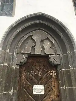 Vchod se nachází na jižní straně kostela. Vstupní portál je profilovaný ze dvou postupně ustupujících žlábků zakončený lomeným obloukem. V tympanonu se nacházejí pozůstatky nedokončeného reliéfu, který má pravděpodobně zobrazovat Krista na Kříži s Pannou Marií a svatým Janem. V rozích vstupního otvoru se nacházejí na konzolách dvě hlavy andělů. Po obou stranách, nad portálem, jsou v různých výškových úrovních dvě zapuštěná okna. Napravo se nachází dvoudílné gotické okno zakončené půlkruhovým obloukem, složené ze dvou takzvaných jeptišek (tvar ohraničení vitráží). Nalevo je pouze jednoduché okno zakončené jeptiškou a vytvarované do lomeného oblouku, které není původní, ale bylo později doděláno.[2]