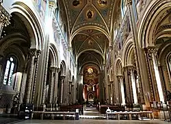Autorem návrhů nástropních maleb ze 60. let byl profesor Josef Matyáš Trenkwald, v letech 1867-1873 je provedli Gustav Vacek, Petr Maixner (jen začal), později František Rudl a bratři Karl a Franz Jobstové, povolaní k tomu úkolu roku 1886 z Vídně. Křestní kapli v secesním stylu vymaloval František Urban roku 1905. Na postranním otáři sv. Václava jsou obrazy českých patronů sv. Vojtěcha, Radima, Ludmily a Prokopa od Josefa Mánesa. Namaloval je v letech 1866 nebo 1867 na soukromou objednávku Marie Riegrové-Palacké. Antonín Lhota namaloval obrazy českých patronů pro oltář P. Marie. Osm obrazů ze života apoštolů namaloval Zikmund Gustav Rudl. Lunetové obrazy z cyklu života svatých Cyrila a Metoděje do presbytáře navrhli a začali malovat František Ženíšek a Maxmilián Pirner v letech 1887-1888, Ženíšek od smlouvy odstoupil pro nízký plat a Pirner odešel kvůli sporu o svou kompozici smrti světce vestoje[2]; dílo dokončili žáci Františka Sequense, mj. Gustav Miksch a Antonín Krisan. Několik návrhových kreseb vytvořil také Felix Jenewein. Tabernákl a další prvky na hlavní oltář navrhl Bedřich Wachsmann v letech 1863-1868.