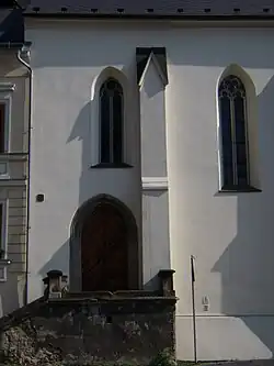 Kostel byl postaven roku 1440. V roce 1444 byl jednoduchý kostel připojen ke špitálu, který měl zástavbu dnešního domu č. p. 128 a domu č. p. 96. Tyto dva objekty propojovala společná střecha. K hornímu konci špitálu navazovala dolní městská brána, což byl velký dům s vysokou střechou s bytem branaře a městským vězením. Je doloženo, že roku 1475 konal bohoslužby kněz jménem Kašpar. Kostel společně se špitálem udržovaly různé nadace, například rodiny Glatz či Jeschka z Koldic.