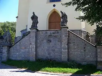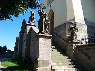 Kolem kostela je hřbitov, který je obehnán zdí s dvěma hrotitými branami, k nimž vede dvouramenné schodiště, které je obestavěné barokními sochami sv. Judy Tadeáše, sv. Václava, sv. Vojtěcha, sv. Prokopa, sv. Floriána a sv. Josefa. Sochy pocházejí z 1. poloviny 18. století z dílny barokních sochařů Jelínků z Kosmonos.