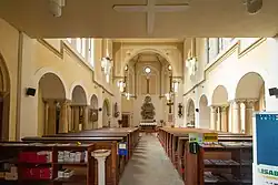 Pseudorománská obdélná jednolodní stavba není orientovaná, polygonální presbytář směřuje k jihu. K hlavní lodi přiléhají po stranách boční kaple, které jsou naznačené sloupy a výklenkovými vestavbami s pěti oblouky. Románské sloupy, které oddělují výklenky, jsou zdobeny hlavicemi s listy. Strop kostela je plochý s klenutou apsidou pro hlavní oltář. V závěru presbytáře je osazena trojice barevných skleněných vitráží s motivy modlících se andělů od malíře Josefa Führicha.