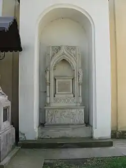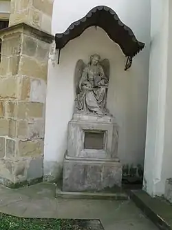 Na vnějších stěnách je asi 30 renesančních i raně barokních náhrobníků, figurálních výjevů a nápisů začínajících rokem 1567.