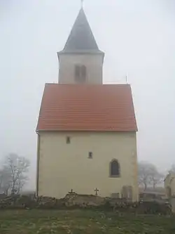 Zřejmě v polovině 13. století byl v sousedství šlechtického sídla postaven románský tribunový kostel. Ten byl upravován v letech 1872 a 1904. Druhá z oprav proběhla podle projektu Josefa Mockera, který výrazně zvýšil věž a opatřil ji novorománskými sdruženými okny.[5] Kostel obklopuje hřbitov, přístupný novogotickou brankou. Na ní jsou umístěny desky s historií objektu a připomínkou pohřbu selských rebelů z povstání roku 1775. Keltské opevnění lokality, o němž se píše na informačních tabulích u kostela, není archeologickým průzkumem prokázáno. Později se zde rozkládalo slovanské hradiště a po něm dnes již zaniklá ves. Kostel je chráněn jako kulturní památka České republiky.[6]