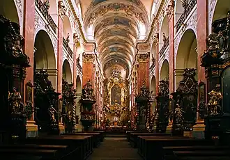 Prostor chrámu tvoří jednoduchou baziliku s tribunami. Interiér je přímo zahlcen mobiliářem, zahrnuje mj. 22 oltářů. Nachází se zde druhá největší sbírka oltářních obrazů od Petra Brandla. Zajímavá je rovněž i zavěšená kazatelna, podpíraná mohutným tělem lva. Mezi zajímavosti patří do zdi vsazená deska v severní boční lodi nad vchodem do ambitu, jež pochází z roku 1615 a nese varování od řezníků, podle kterého bude každý, kdo kostel ohrozí, rozsekán na kusy. Při prováděných opravách byly na některých místech trojlodí odhaleny drobné gotické prvky a části zdiva.