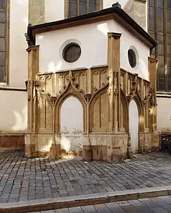 - ↑ Erb s trofejní výzdobou se původně nacházel nad vstupem do kaple na jižní vnitřní stěně presbytáře. Při regotizaci byl převeden do městského lapidária a zazděn do severního křídla Biskupského dvora, a poté byl teprve instalován Fuchsem nad náhrobek.