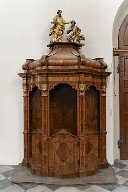 - ↑ Skříň musela být roku 1826 z provozních důvodů posunuta více dozadu ke zdi, kvůli čemuž se zhoršila viditelnost varhan.