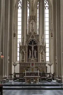 - Hlavní oltář: novogotický, navržen roku 1881 Heinrichem von Ferstelem, stavbu realizoval Johann Eduard Tomola (1888–1895), na architektuře z různobarevných mramorů jsou pískovcové sochy, uprostřed Kalvárie, po stranách sv. Cyril a sv. Metoděj a pod vrcholovým baldachýnem sv. Jakub.