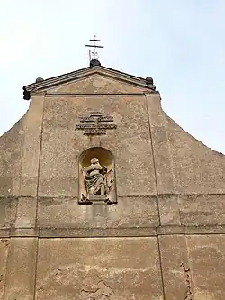 Průčelí kostela se sochou a nápisem
