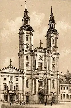 Během protireformace byla budova předána jezuitskému řádu, který v letech 1700–1706 zde od západní strany vystavil svou kolej. V roce 1714 byl starý kostel zbořen kvůli nevyhovujícímu technickému stavu. Zachoval se pouze presbytář a mauzoleum Piastovců. Současný chrám byl postaven v letech 1714–1727 na místě starého kostela.