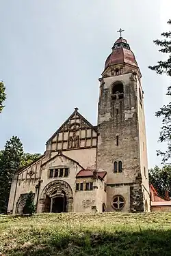 Architektonicky je kostel kombinací románských prvků s prvky tehdy moderní strohé, geometrické secese. To se projevuje jak v základním utváření hmot, tak i v detailech, například v malované výzdobě interiéru. Kromě toho lze v ornamentu nalézt též ohlas byzantského umění. Shodně je řešen i mobiliář. Výrazně se v interiéru kostela uplatňuje surový beton, z něhož jsou vytvořeny stropy, překlady oken a dveří, sloupy mezilodních arkád, ale také křtitelnice v křticí kapli umístěné v podvěží. Na exteriéru kostela je naproti tomu výrazně uplatněn tesaný kámen (pískovec), z něhož jsou vytvořeny veškeré architektonické prvky (například vstupní portál, ostění oken, členění štítu atp.). Samotné cihelné zdivo je však uvnitř i vně kostela omítané.[2]