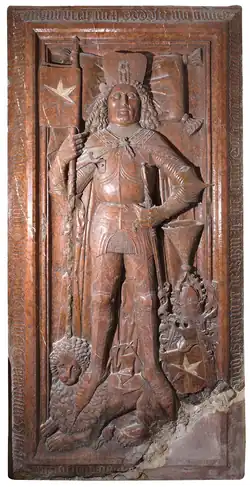Je to nejstarší památka kostela, pochází z roku 1467. Na horní straně tumby se nachází náhrobní deska, na níž je vyobrazen reliéf rytíře. Je proveden v tradičním stylu, pod hlavou rytíře je polštář, pod nohama mu leží lev, v levé ruce drží meč a v pravé ruce drží hůl s praporem s rodovým erbem.