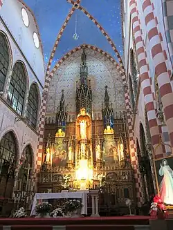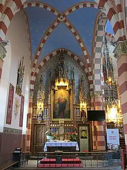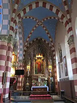 Hlavní oltář z pozlaceného dubu byl vytvořen v roce 1927 ve třech kompozičních úrovních. Po stranách jsou dva obrazy místního malíře Mariana Strońského. Mezi nimi jsou čtyři gotické věžičky s postavami světců: sv. Tereza z Ávily, sv. František Saleský, sv. Barbora a sv. Stanislav Kostka. V letech 1949-1950 byly postaveny dva boční oltáře, které vytvořil místní sochař Kazimierz Koczapski. Na pravé straně je oltář "Srdce Ježíšova", po stranách dvě sochy svatých: sv. Pius X. a sv. František Saleský. Vlevo je oltář "Panny Marie Pomocnice křesťanům" s postavami bl. Augusta Czartoryského a sv. Dominika Savio.
