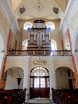 Na kůru jsou umístěny varhany, jejichž zvuk dotváří atmosféru kostela. Varhanní skříň je v klasicistním stylu. Ve srovnání s celkovou nádherou kostela jsou varhany poměrně jednoduché. Když je postavil Otto Rieger z Budapešti, byly to dvoumanuálové varhany, ale v roce 1995 byly přestavěny na třímanuálové. Mistři z Kutné Hory z české firmy Organa přidali 7 nových rejstříků a upravili celou původní dispozici. Po poslední rekonstrukci mají varhany 2228 píšťal.[3]