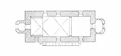 Hlavní loď kostela je zaklenuta valeně se stýkajícími se lunetovými výsečemi, presbytář má klenbu plackovou, obě části odděluje polokruhový triumfální oblouk, západní kruchta je podklenuta valeně.[7]