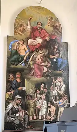 - Oltářní obraz Svatý Karel Boromejský v doprovodu tří personifikací: Víry v podobě mladé ženy, Naděje v podobě chlapce s kotvou a Lásky v podobě zralé ženy ochraňuje sirotky, matky s dětmi, nemocné a trpící