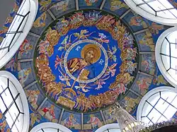 Pod centrální kopulí se nachází 3,5 m vysoký trůn. Dva další naproti němu jsou vysoké každý 2 metry a podle zvyklosti mají být určeny pro pantokratora a jeho císařovnu. Unikátní je, že v tomto kostele je Ježíš Kristus namalován na ploše 70 m², přičemž každé jeho oko má průměr 1,5 m. Odklon od tradice spočívá v tom, že starozákonní proroci jsou zobrazeni jako sedící, nikoliv vestoje. Druhou odchylkou od pravoslavné tradice jsou velká okna. Aby se zabránilo velkému množství světla, které by narušovalo klasické vnímání interiéru kostela, jsou částečně zateměna akrylátem, který vytváří do jisté míry hru světel.