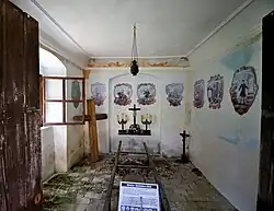 Vnitřek je s jednotným kazetovým stropem a trojhrannou dřevěnou kruchtou.[4] Je bohatě malovaný rokokovou ornamentikou. Na poprsni kruchty je 17 obdélných malovaných výjevů z Nového zákona a dvě signované krajinomalby od J. J. Schölera (J. J. Schoellera) z Liberce z roku 1760. V presbytáři jsou zbytky původních ornamentálních raně barokních maleb.[2]