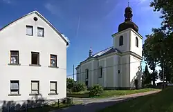 ![]() Kostel sv. Linharta s farou za kostelem a školou vlevo od kostela | |