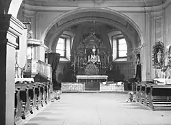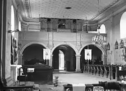 Ve vstupní části lodi se nachází kůr, který byl pořízen při zásadním rozšíření kostela na počátku 18. století. Latinsky psaná pamětní deska připomínající stavbu nejen kruchty, ale i současné věže a dalšího vybavení je umístěna napravo od vstupu do lodi.[14] Po obou stranách vstupu jsou umístěny dvě zpovědnice pocházející z počátku 20. století. Zbytek prostoru chrámové lodi vyplňují lavice pocházejícími z přelomu 18. a 19. století,[9] což z nich činí nejstarší dosud užívané vybavení kostela.