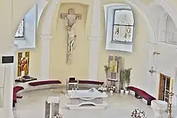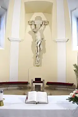 Svatostánek je poměrně netradičně umístěn nikoli v centru presbytáře, ale pod vitrážovým oknem sv. Metoděje. Příčinou této změny bylo dlouhodobé zapůjčení sádrového modelu Ukřižovaného sochaře Josefa Václava Myslbeka z pražské Národní galerie.[9] Zavěšení monumentálního kříže rovněž vedlo k zazdění centrálního okna s vitráží sv. Martina. Patron kostela tím přišel o reprezentativní místo v presbytáři. V rámci výmalby kostela v roce 2019 došlo k pořízení nového obrazu sv. Martina a jeho umístění pod vitrážové okno sv. Cyrila. Autor Sergej Kulina z Kunštátu ve známé scéně obdarování žebráka částí pláště ztotožnil osobu sv. Martina s Ježíšem Kristem. Po obou stranách jsou pak znázorněny proměny světcova života včetně odkazů na současné svatomartinské tradice.[18] Obraz společně s novou budovou komunitního centra Lotos požehnal při slavnostní bohoslužbě kardinál Dominik Duka.[19]