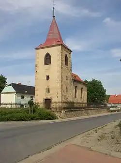 Jedná se o podélnou jednolodní stavbu s odsazeným, polokruhově uzavřeným presbytářem z roku 1776 a malou sakristií, které přiléhá k severnímu boku. V jeho západním průčelí se nachází hranolová věž gotického původu, která je vzhledem ke kostelu mohutná. Věž byla obnovena po požáru v roce 1592 a částečně se dochovalo její renesanční sgrafitové kvádrování. Ve spodních patrech se věž kromě pravoúhlého západního portálu s kamenným ostěním otevírá štěrbinovými okénky, které jsou v osách stěn. Horní zvonové patro věže má čtyři velká zvuková okny se segmentovými záklenky. Střecha věže je jehlancová, projmutá. Na vrcholu věže je korouhvička s letopočtem 1595, kdy byl kostel po požáru opraven.[1]