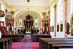 Z doby přestavby v letech 1755–1756 pochází převážná část vnitřního rokokového zařízení kostela.[9]
