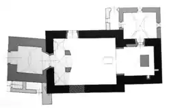 Loď má mírně nepravidelný obdélníkový půdorys s rozměry 12,3 x 9,8-10 m, se zdmi širokými 1,2 m. Podélné strany jsou lemovány korunními římsami a prolomeny dvojicí segmentově klenutých oken. Na severní straně je loď doplněna o podélný otvor vstupu. Jihozápadní nároží podepírá mohutný pilíř.